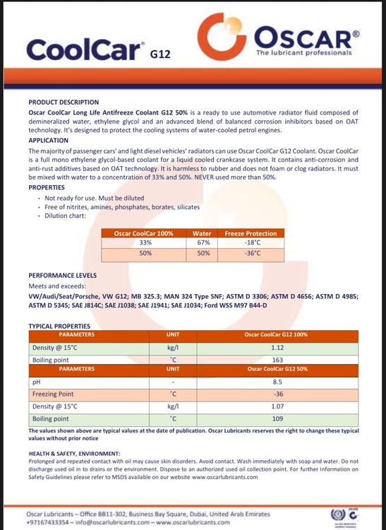 • مطابقت با استانداردها: این محصول استانداردهای مختلف خودروسازان و موسسات بینالمللی را برآورده میکند، از جمله VW/Audi/Seat/Porsche (VW G12)، MB 325.3، MAN 324 Type SNF، ASTM D 3306، SAE J814C و سایر استانداردها.