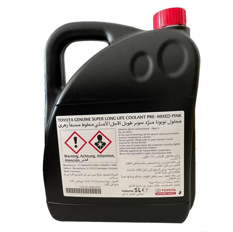 کولانت تویوتا سوپر لانگ لایف ساخت کشور آلمان، با حجم 5 لیتر و رنگ قرمز می باشد. ترکیبات این محصول آماده مصرف شامل 50٪ ضدیخ و 50٪ مایع رادیاتور است و نیازی به اضافه کردن آب ندارد. کولانت قرمز تویوتا بر پایه اتیلن گلیکول فرموله شده است و موجب حفظ دمای ایده آل پیشرانه، محافظت از سیستم خنک کننده در برابر استهلاک و خوردگی و مانع از تشکیل رسوبات می شود.